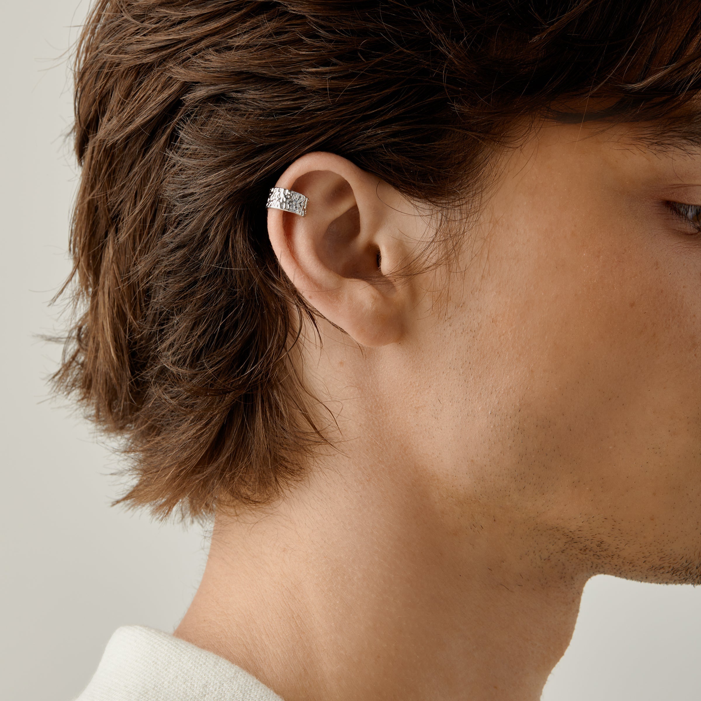 Elevate your style effortlessly with the Hammered Ear Cuff in Silver. Designed to comfortably fit thick, large, sensitive, or small ears, this adjustable cuff gently conforms to your ear for a secure yet pain-free wear up to 24 hours. Its unique hammered texture adds a bold, contemporary edge, making it a versatile accessory for any look. Slip it on and enjoy a statement piece that combines comfort and striking design.