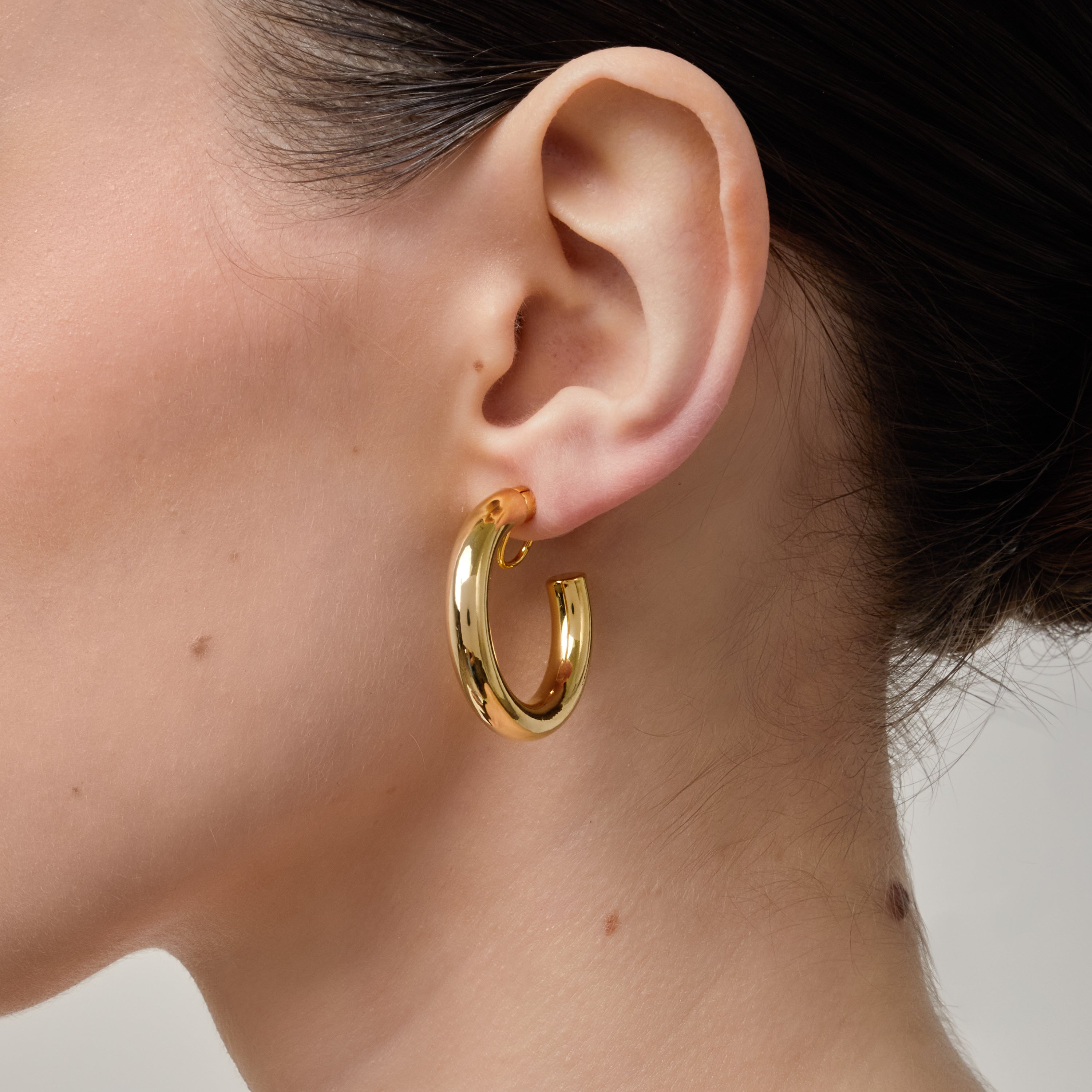 Allie Hoop Clip On Earrings in Gold have a Mosquito Coil Clip-On Closure, making them suitable for Thick/Large Ears, Sensitive Ears, Small/Thin Ears, Stretched/Healing Ears, and Keloid Prone Ears. They provide a Medium Secure hold and can be adjusted by gently squeezing the padding forward once on the ear. Each purchase includes one pair of earrings.