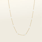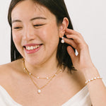 This adjustable Elena Pearl Necklace in Gold, waterproof and hypoallergenic, is graced by a model showcasing its luxurious allure. Even with their natural variations in size and hue, each pearl lends a distinctive charm to this elegant design.