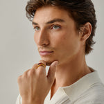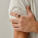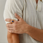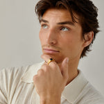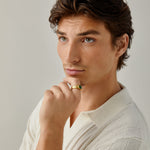 The Gemstone Ribbed Ring in Gold is crafted from stainless steel with an 18K gold plating for lasting beauty. It features a 10mm width and weighs 7.9g, offering a bold yet comfortable fit. Resistant to tarnish and water, this ring maintains its shine and durability, making it an essential accessory that stands the test of time.