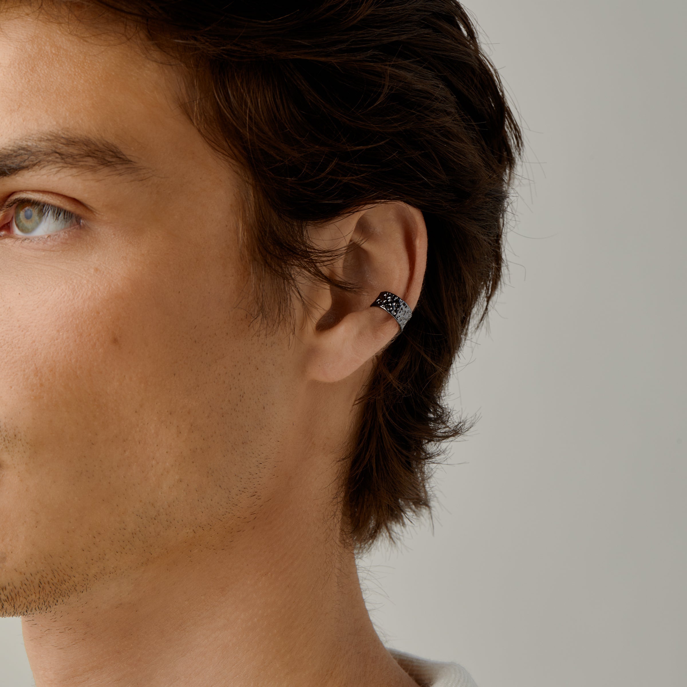 Elevate your style effortlessly with the Hammered Ear Cuff in Black. Designed to comfortably fit thick, large, sensitive, or small ears, this adjustable cuff gently conforms to your ear for a secure yet pain-free wear up to 24 hours. Its unique hammered texture adds a bold, contemporary edge, making it a versatile accessory for any look. Slip it on and enjoy a statement piece that combines comfort and striking design.