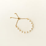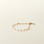 The Emi Pearl Bracelet adorning a model's arm boasts a slight variance in size and hue whilst remaining water-resistant and hypoallergenic.