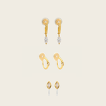 This set consists of a pair of each of the following: Tiny Marquise Hoop Clip On Earrings in Gold, Mini Marquise Hoop Clip On Earrings in Gold, and Marquise Stud Clip On Earrings in Gold