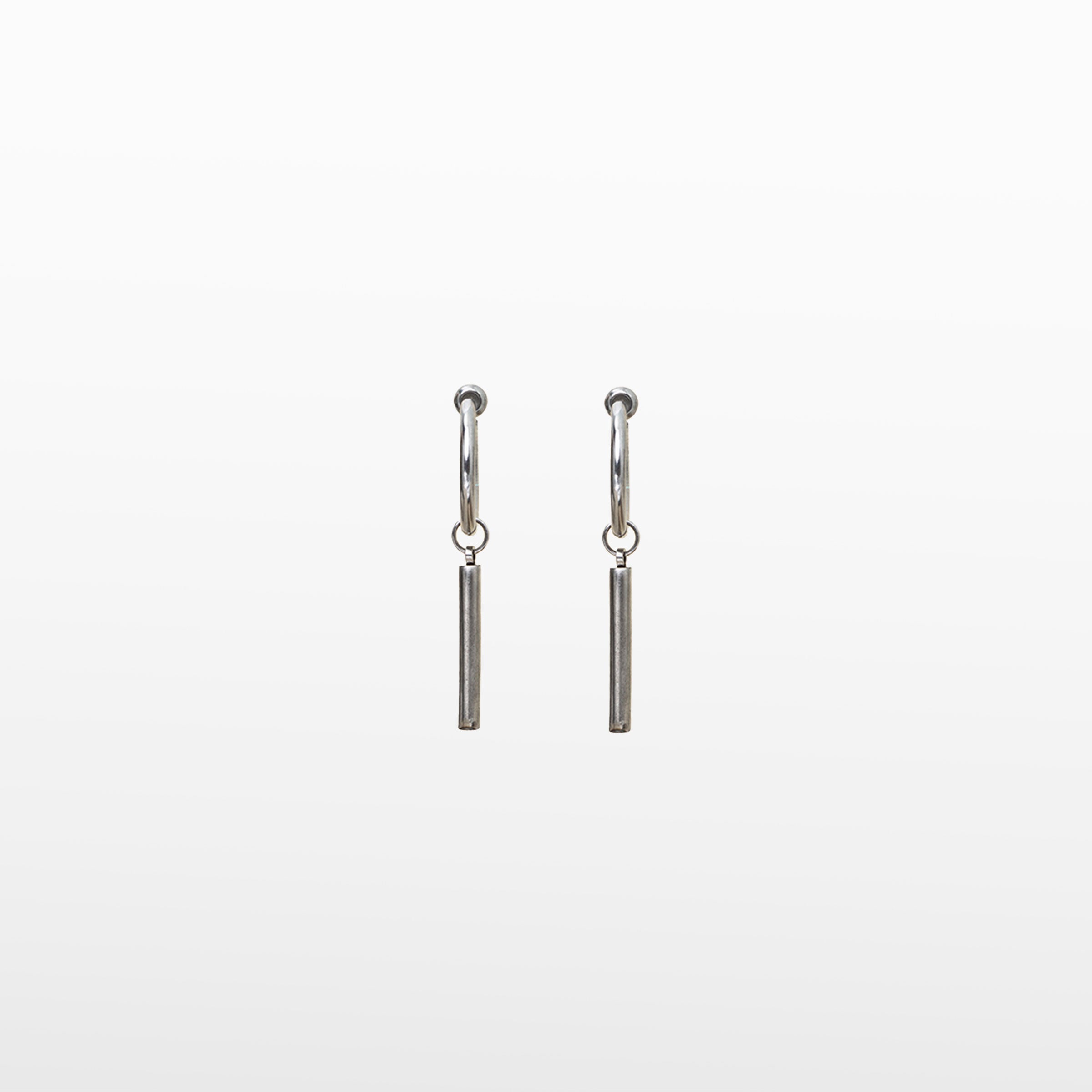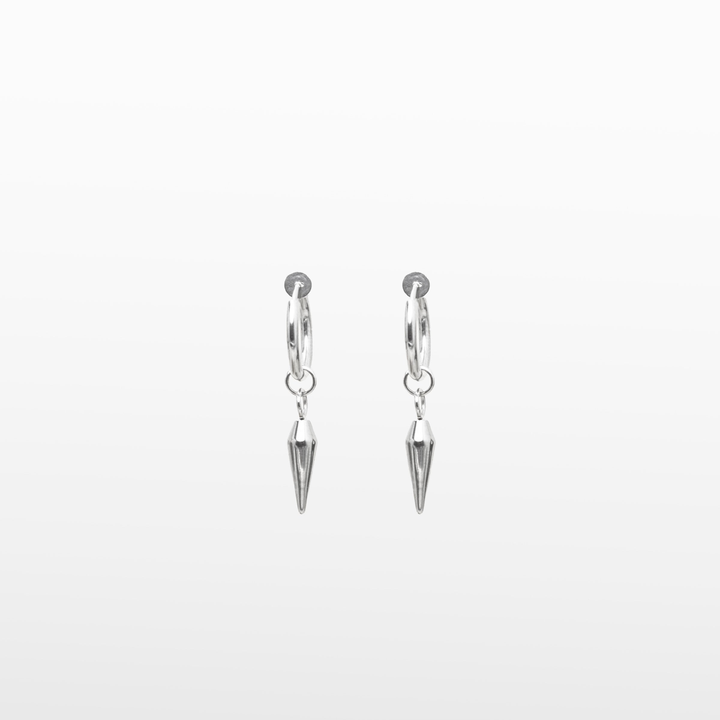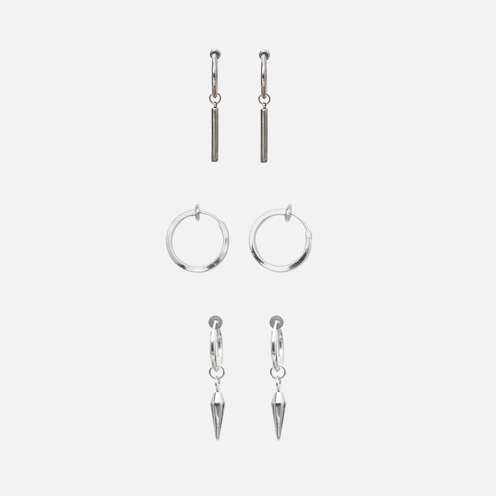 This set consists of a pair of each of the following: Dagger Clip On Earrings, Bar Clip On Earrings, and Classic Hoop Clip On Earrings in Silver