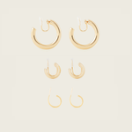 This set consists of a pair of each of the following: Allie Hoop Clip On Earrings in Gold, Simple Huggie Clip On Earrings in Gold, and Tiny Hoop Clip On Earrings in Gold