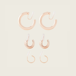 This set consists of a pair of each of the following: Allie Hoop Clip On Earrings in Rose Gold, Simple Huggie Clip On Earrings in Rose Gold, and Tiny Hoop Clip On Earrings in Rose Gold