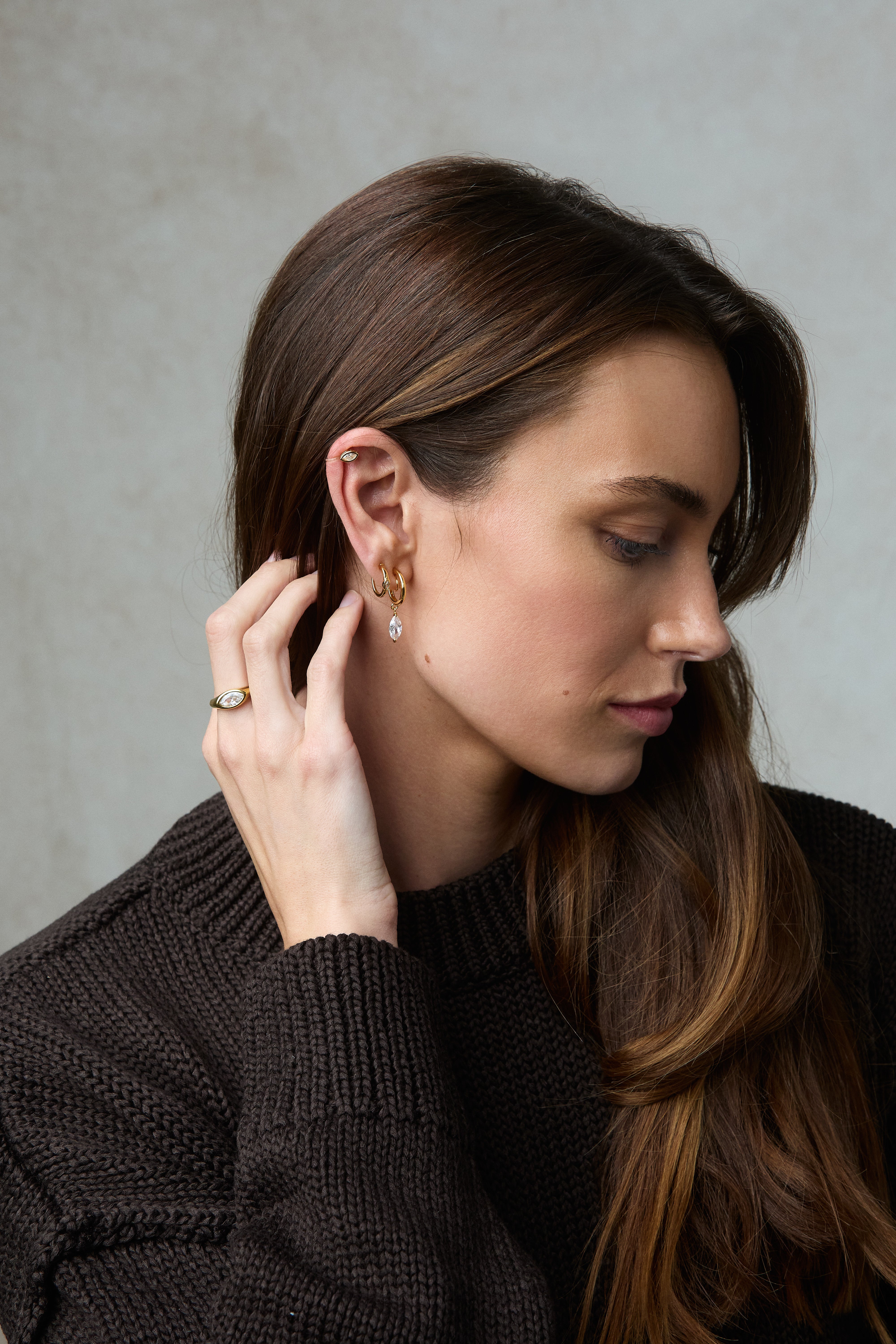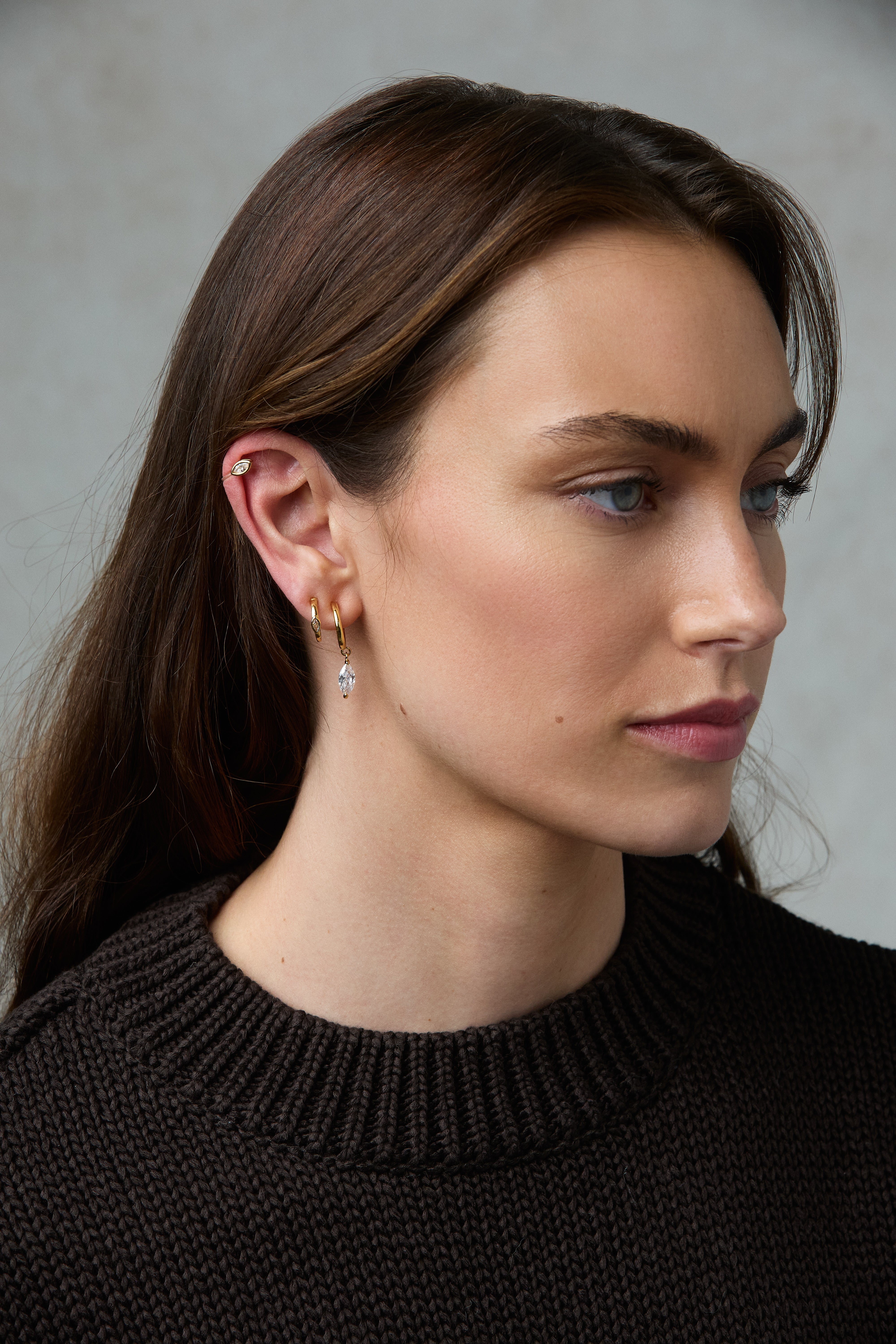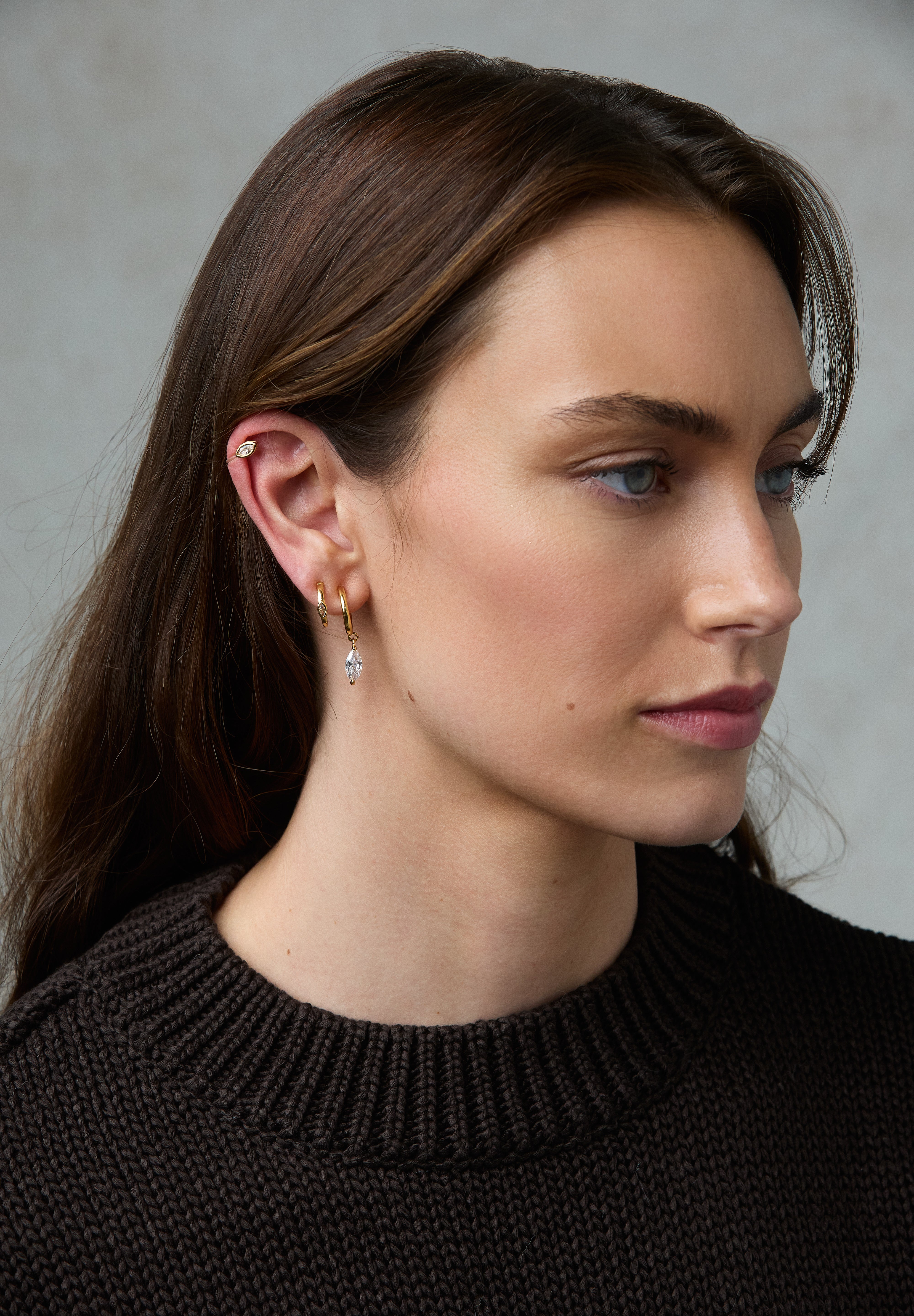 This set consists of a pair of each of the following: Tiny Marquise Hoop Clip On Earrings in Gold, Mini Marquise Hoop Clip On Earrings in Gold, and Marquise Stud Clip On Earrings in Gold